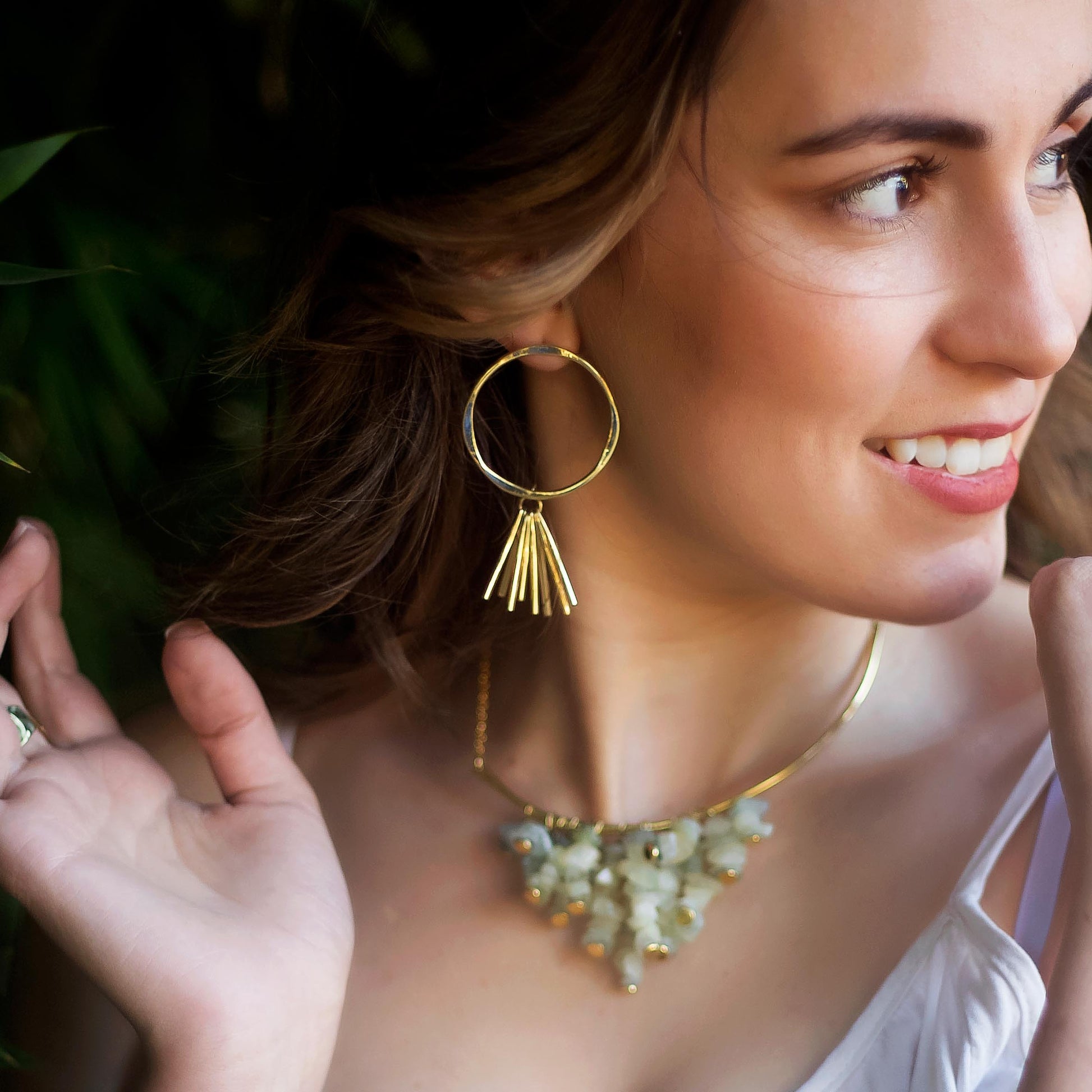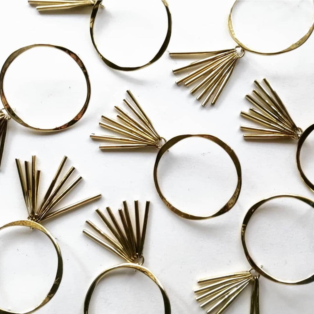 Our APONI Earrings are available in brass or silver. The hoops have a beautiful hammered texture and are decorate with tassels.