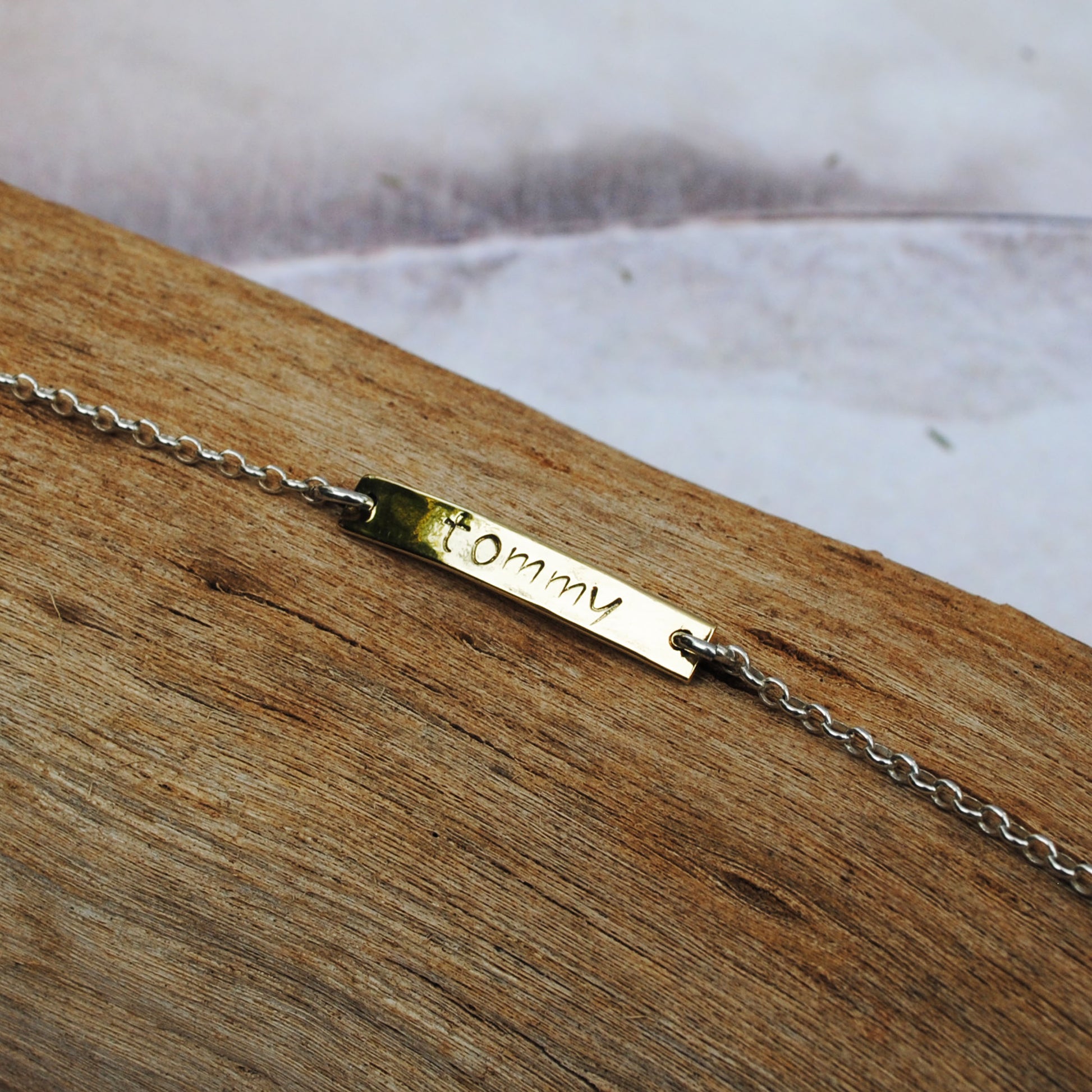 Our BAR Bracelet is 5mm in height and has a width of 3cm - in the event that wording stamped is too long for the standard 3cm bar, the bar will be elongated accordingly. The bar has a slight curve for a beautiful fit on the wrist. The chain attached to the bar is a sterling silver Belcher chain with a width of 2.17mm. They are availabe in a variety of finishes: Hammered, Smooth, Dotty, Scratch or Rough Rock.