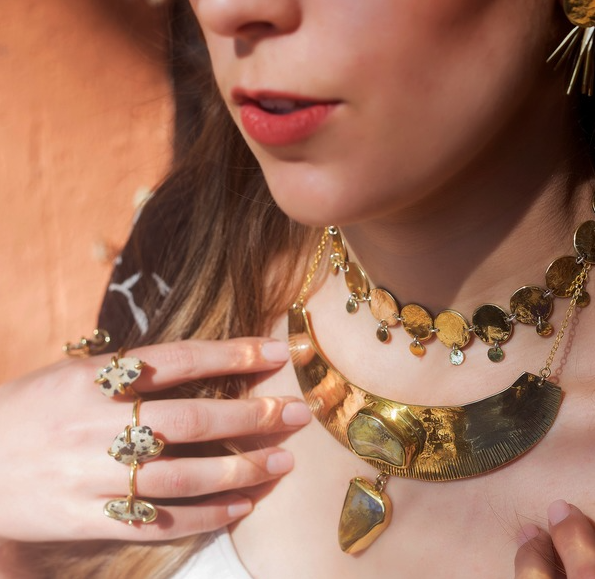Our BlueBeu Neckpiece is made with a curved metal shape hammered with a beautiful texture. One stone is attached on top of the neckpiece the other stone dangles from it. The neckpiece is attached to a sterling silver Belcher chain with extenders to allow adjustment.