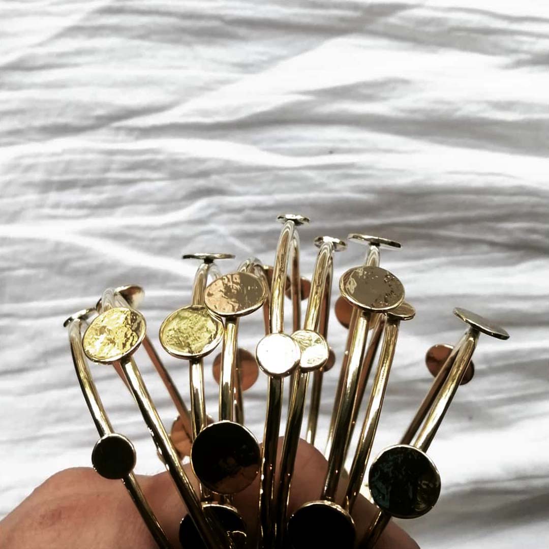 Our Boogie Woogie Bangles are available in your choice of brass or silver. They are made from wire with a thickness of 2.5mm. They are decorated with 5 dots with a beautiful hammered texture. The dots are available in 2 different sizes. Small dots are 8mm in size and medium dots are 10mm in size.