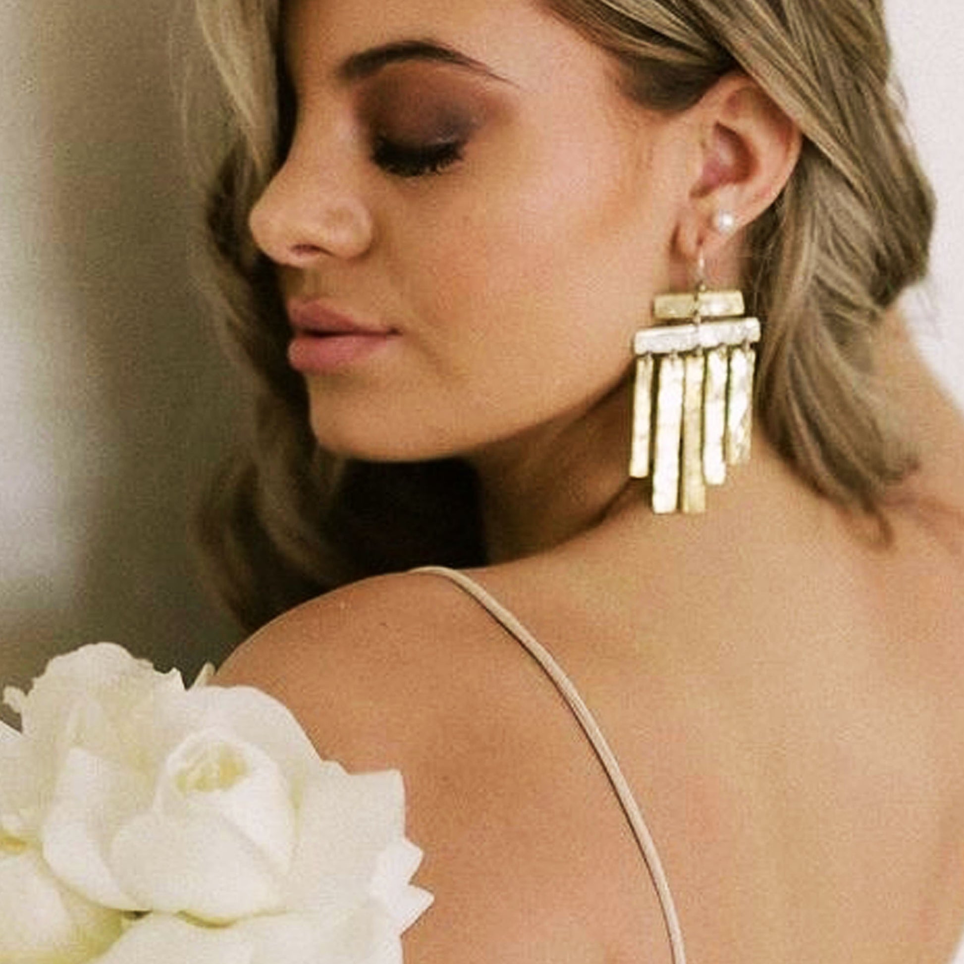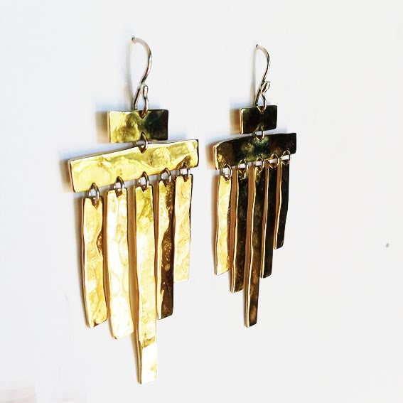 Our Ceroc Earrings are made up with hammered brass bars and have a sterling silver earing hook.