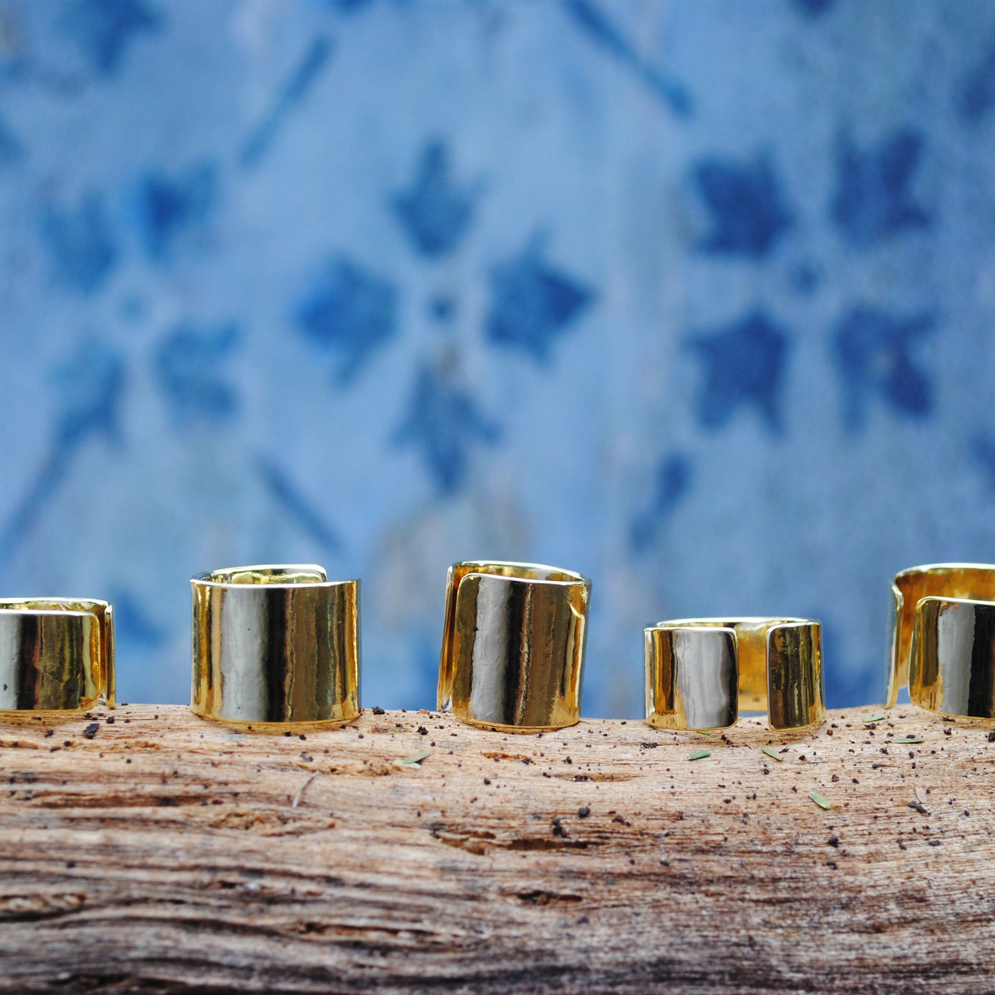 Our CHUNK Ring is available in brass, copper and sterling silver. The rings are open at the back, so is adjustable to an extent, but is still made to size to ensure a comfortable fit.