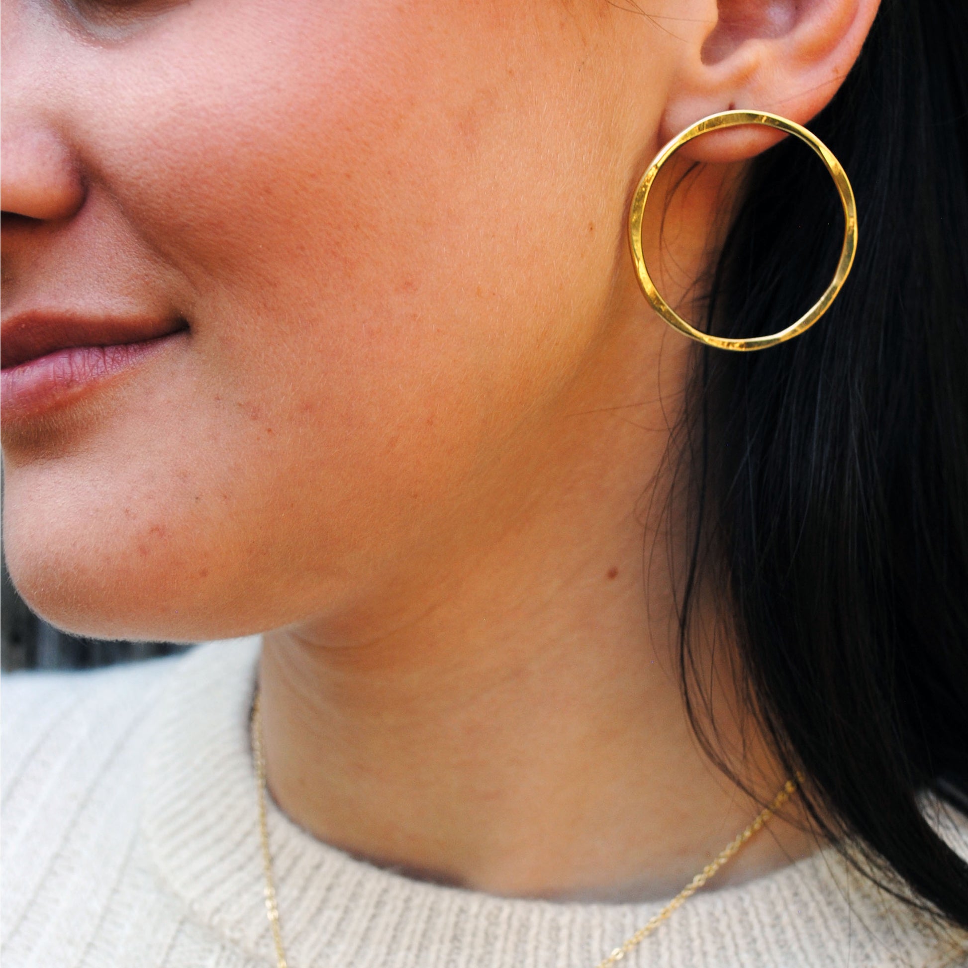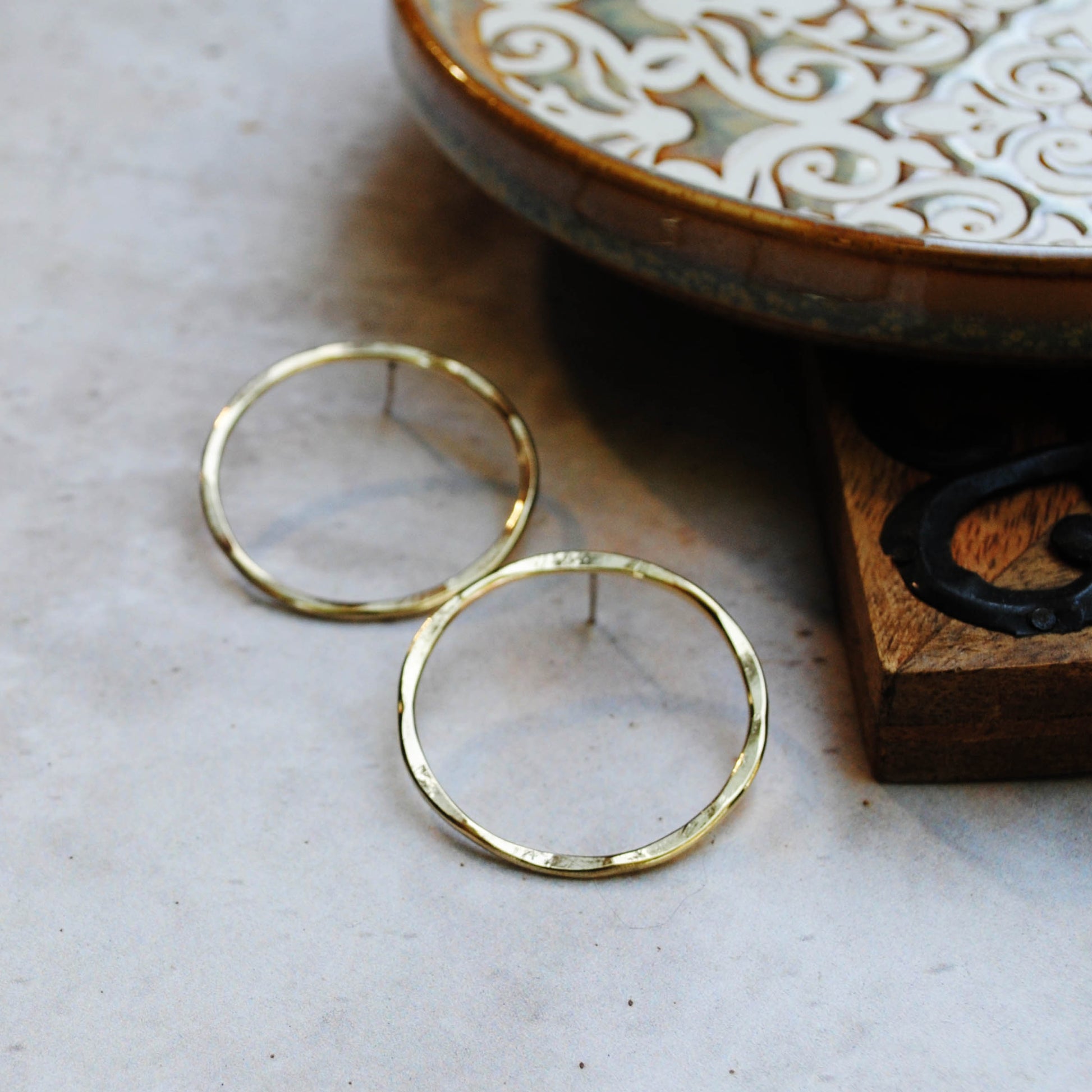 The BIMBA Stud Earrings are approximately 32mm in diameter. The hammered hoops are available in brass or silver.