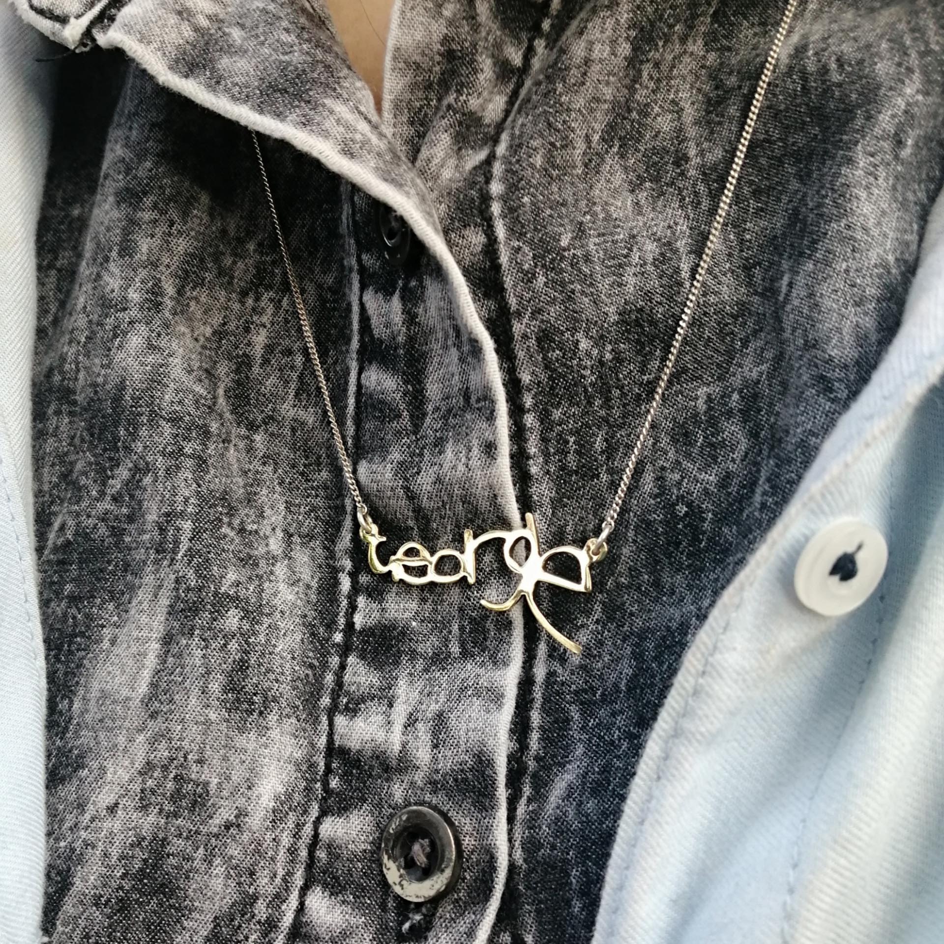 Our Handwriting Necklace is available in brass or silver. The wording is approximately 12mm in height!