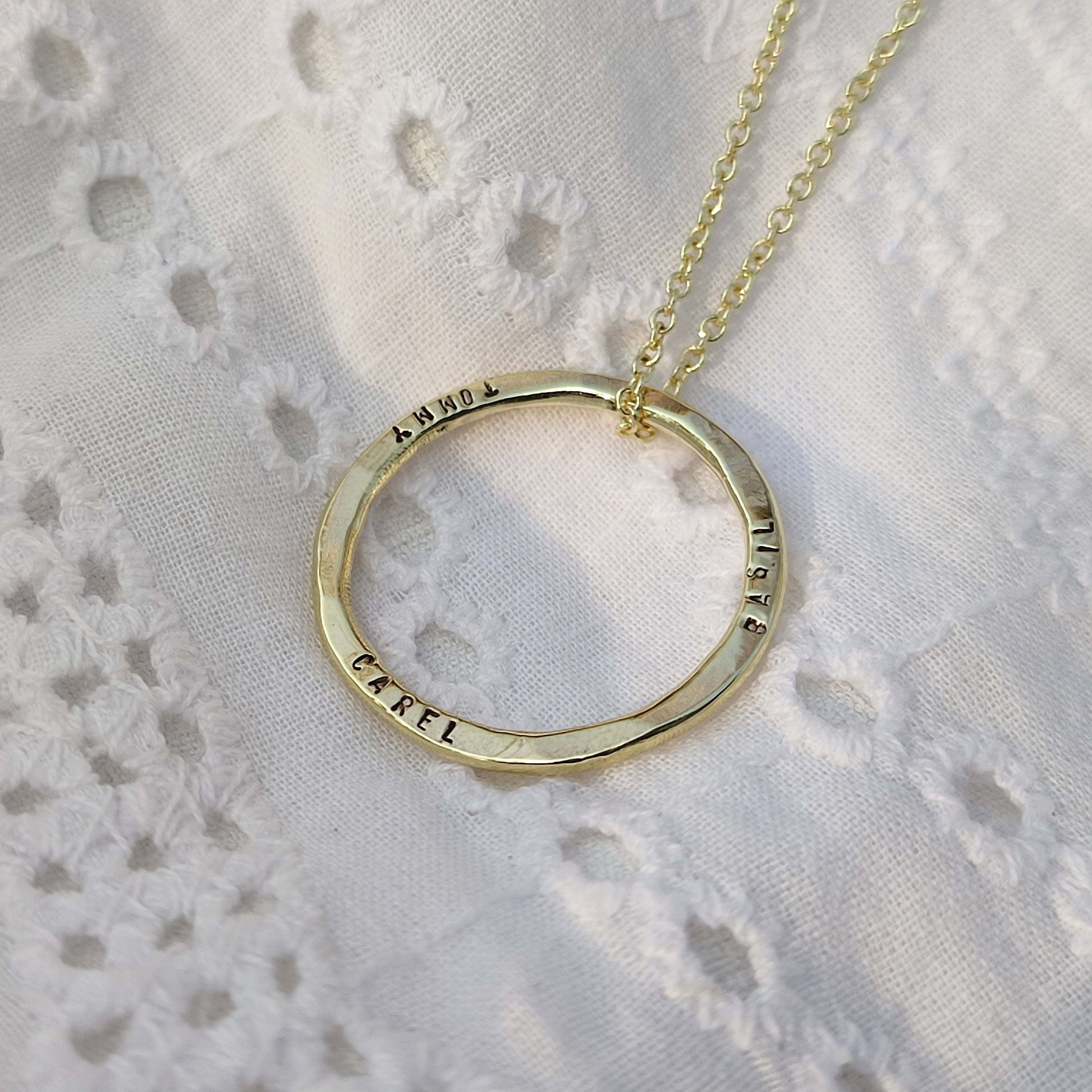 Our Hammered Hoop Name Necklace is available in brass or silver and comes in a variety of sizes.