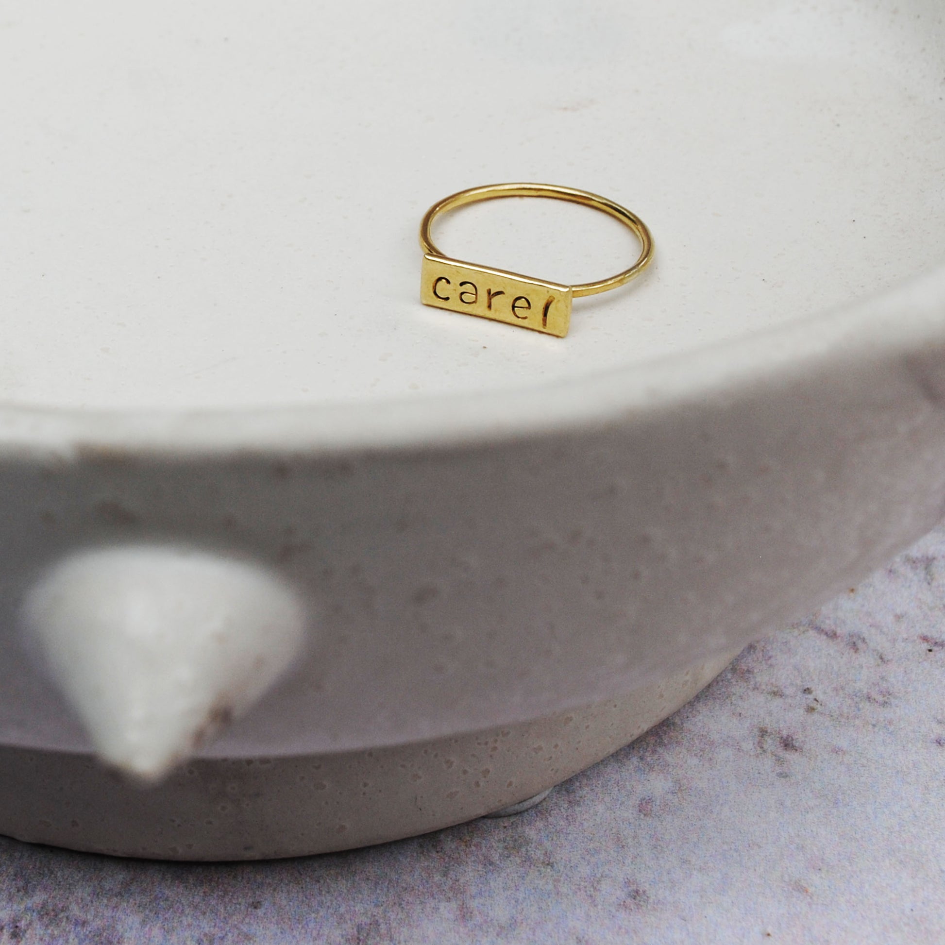 Our HORIZONTAL BAR Ring is available in brass, copper or sterling silver. The bar's length is determined by the amount of letters stamped. If you would like the bar/bars to be specific lengths, kindly get in touch to discuss. They are availabe in a variety of finishes: Hammered, Smooth, Dotty, Scratch or Rough Rock.