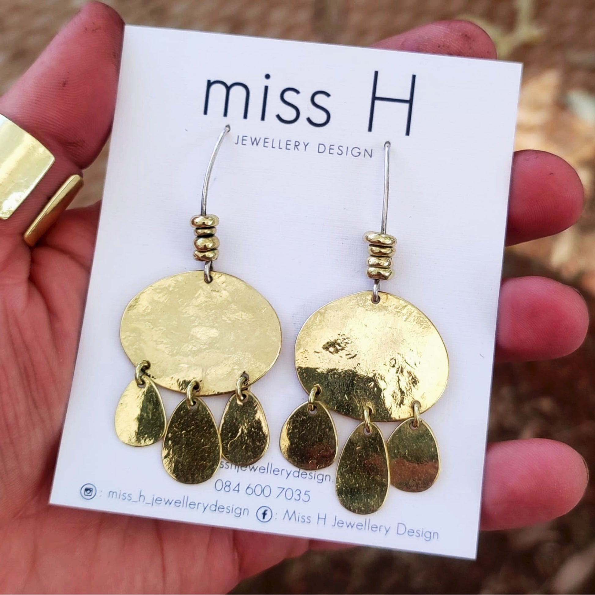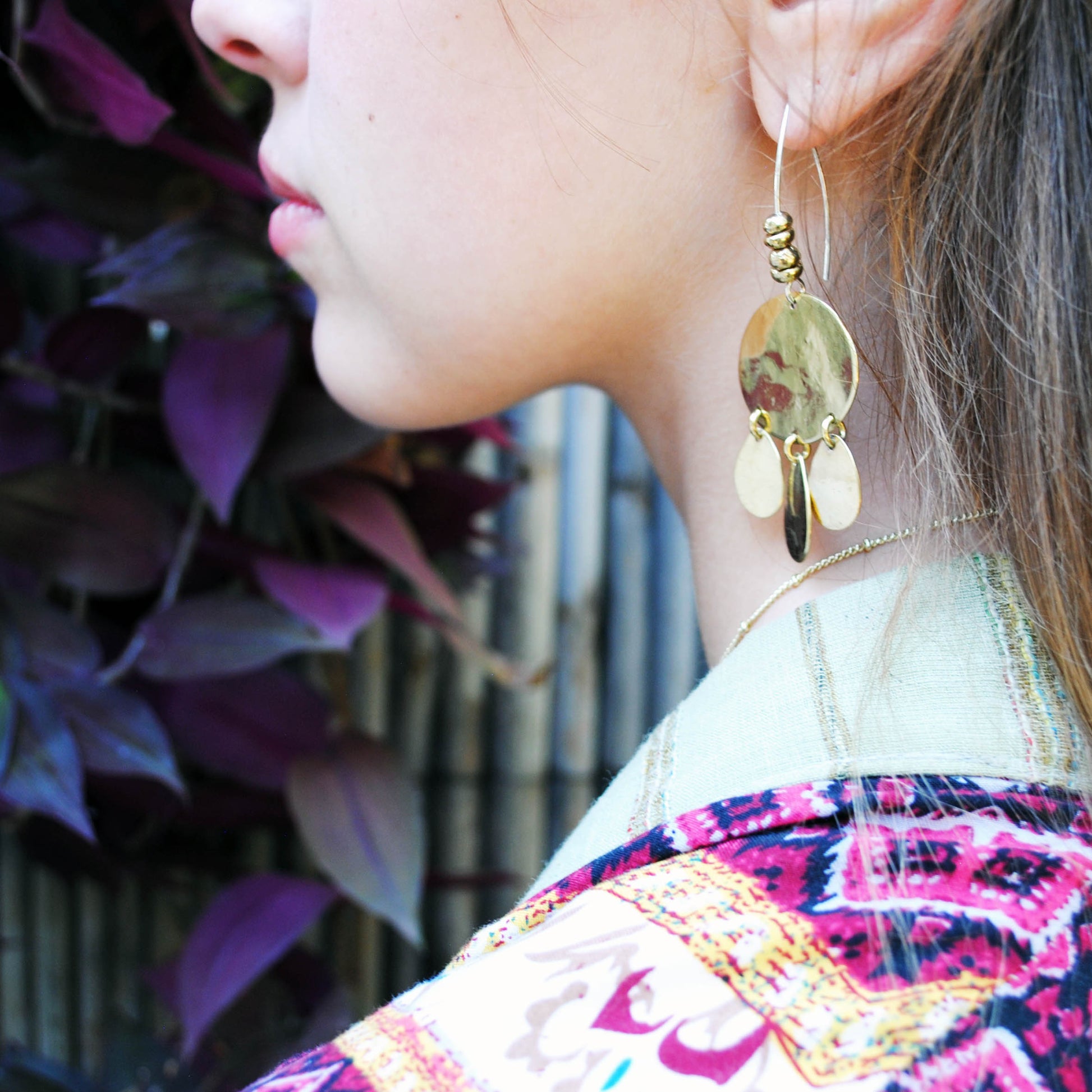 Our NOAH Dangly Earrings are made up with lightweight hammered brass, copper or silver discs. They available in your choice of a sterling silver or stainless steel earring hooks decorated with handcrafted metal beads. They are approximately 25mm in width and 60mm in height.