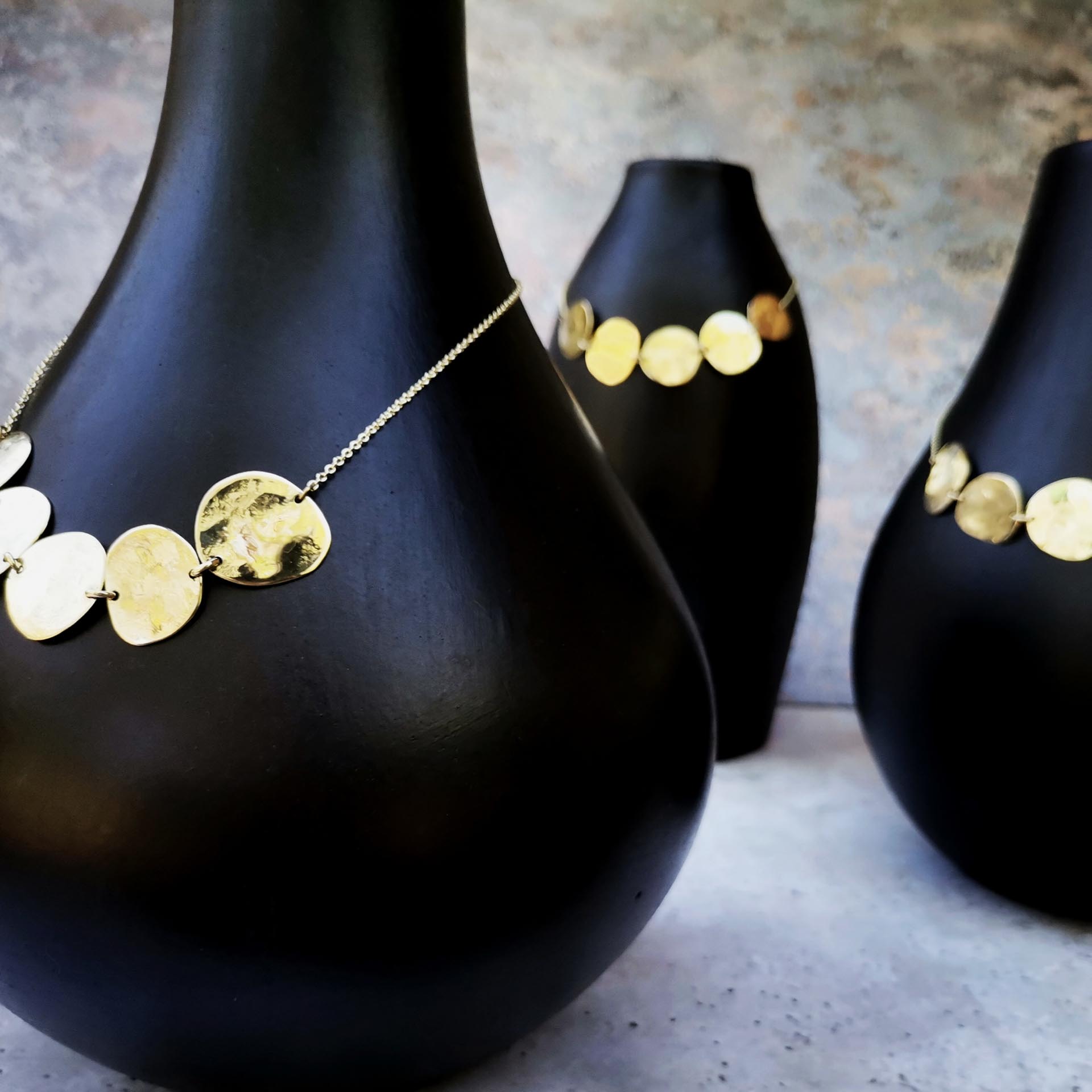 The off-cuts are cut into organic shapes (shapes can be approximately 10mm -15mm x 20mm – 25mm) given a hammered texture and they are then assembled into a necklace.