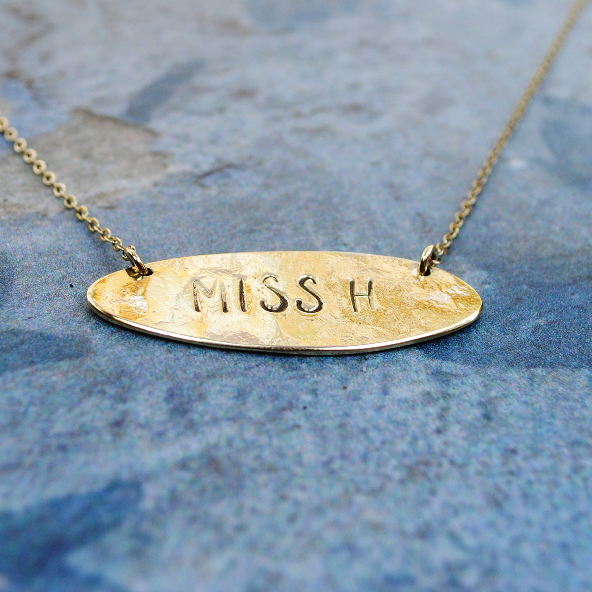 The Nugget Name Necklace is available in your choice of brass, copper or sterling silver! It comes on a 47cm sterling silver Belcher Link chain with extenders.