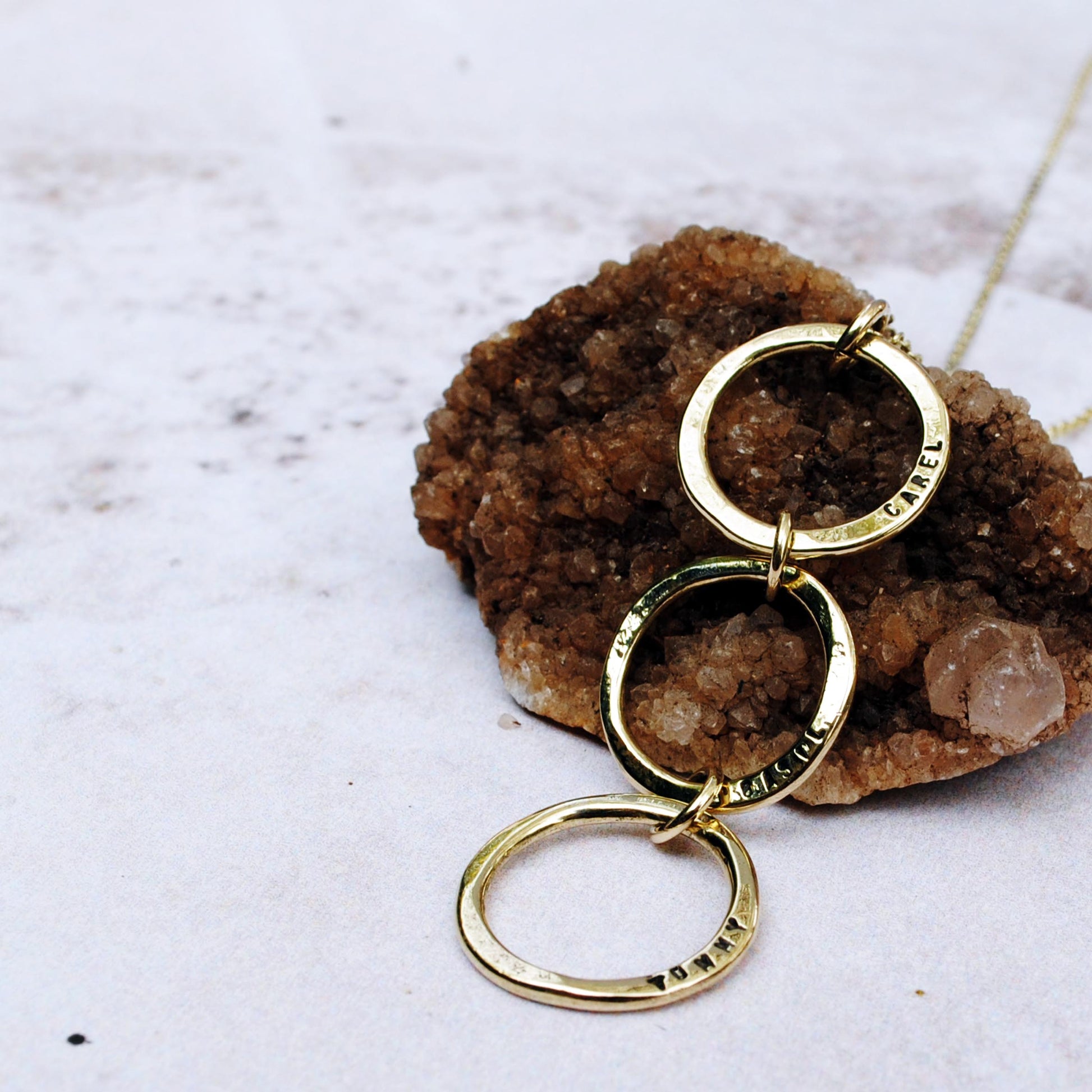 Our Personalised Bimba Necklace Horizontal is made up from 1, 2 or 3 hammered hoops.