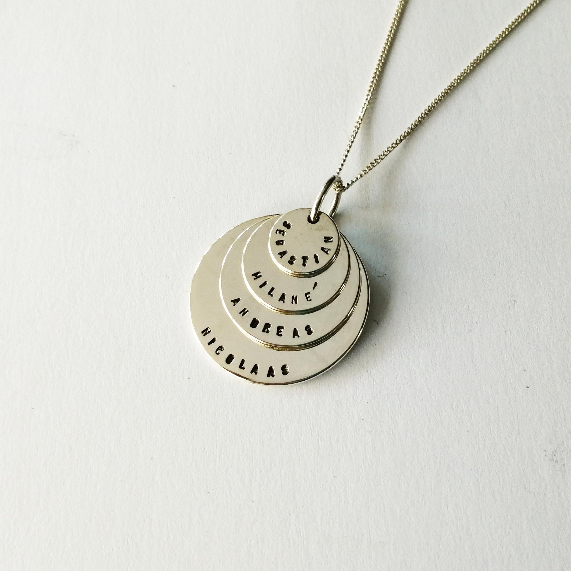 Our Quadruple Punch Disc Necklace is available in Brass, Copper or Silver.
