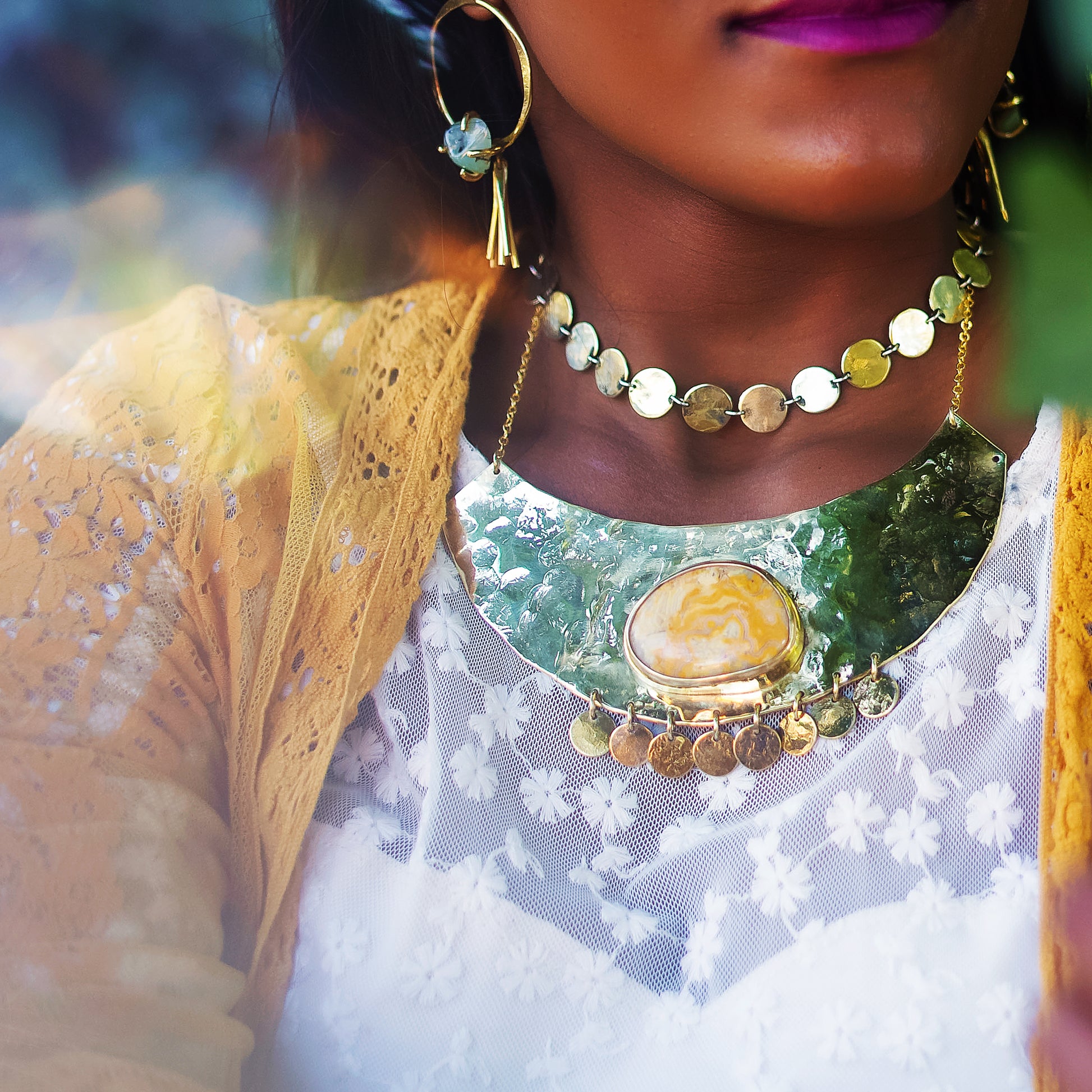 Our TESS Neckpiece is made with a curved metal shape hammered with a beautiful texture. One stone is attached on top of the neckpiece and decorated with discs dangling from it. The neckpiece is attached to a sterling silver Belcher chain with extenders to allow adjustment.