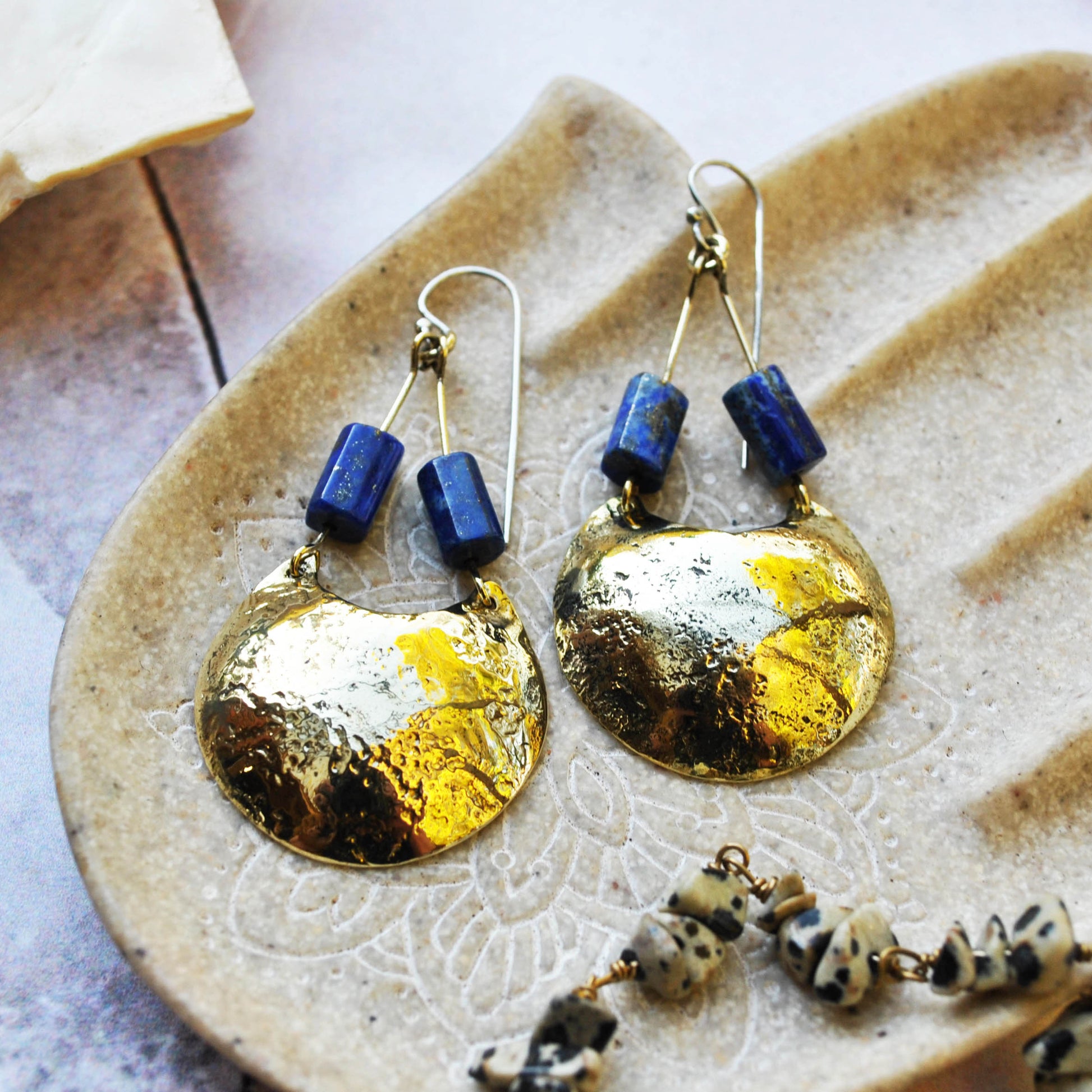 The SELENE Earrings are made from brass domed discs with our rough rock texture. They are decorated with Lapiz Lazuli beads and have a sterling silver earring hook. They are approximately in 34mm in width and in 70mm in height (including earring hook).